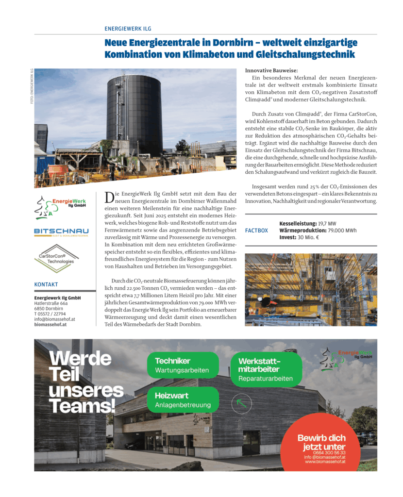 Ein besonderes Merkmal der neuen Energiezentrale ist die weltweit erstmals kombinierte Anwendung von Klimabeton mit dem CO₂-negativen Zusatzstoff Clim@add® und moderner Gleitschalungstechnik. Durch den Zusatz von Clim@add® wird Kohlenstoff dauerhaft im Beton gebunden und eine stabile CO₂-Senke im Baukörper geschaffen. Die eingesetzte Gleitschalungstechnik ermöglicht eine schnelle, präzise und effiziente Bauweise und reduziert zugleich Bauzeit und Schalungsaufwand. Insgesamt werden dadurch rund 25 % der CO₂-Emissionen des verwendeten Betons eingespart – ein klares Bekenntnis zu Innovation, Nachhaltigkeit und regionaler Verantwortung.